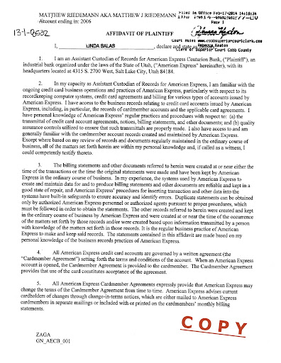 This 'Affidavit of Plaintiff' ran 17 pages, only these first 4 pages are worth reading, the other 13 are just copies of the Amexp cardholder agreement. It took a long time to get this information from the Court as it was not published at their online site.